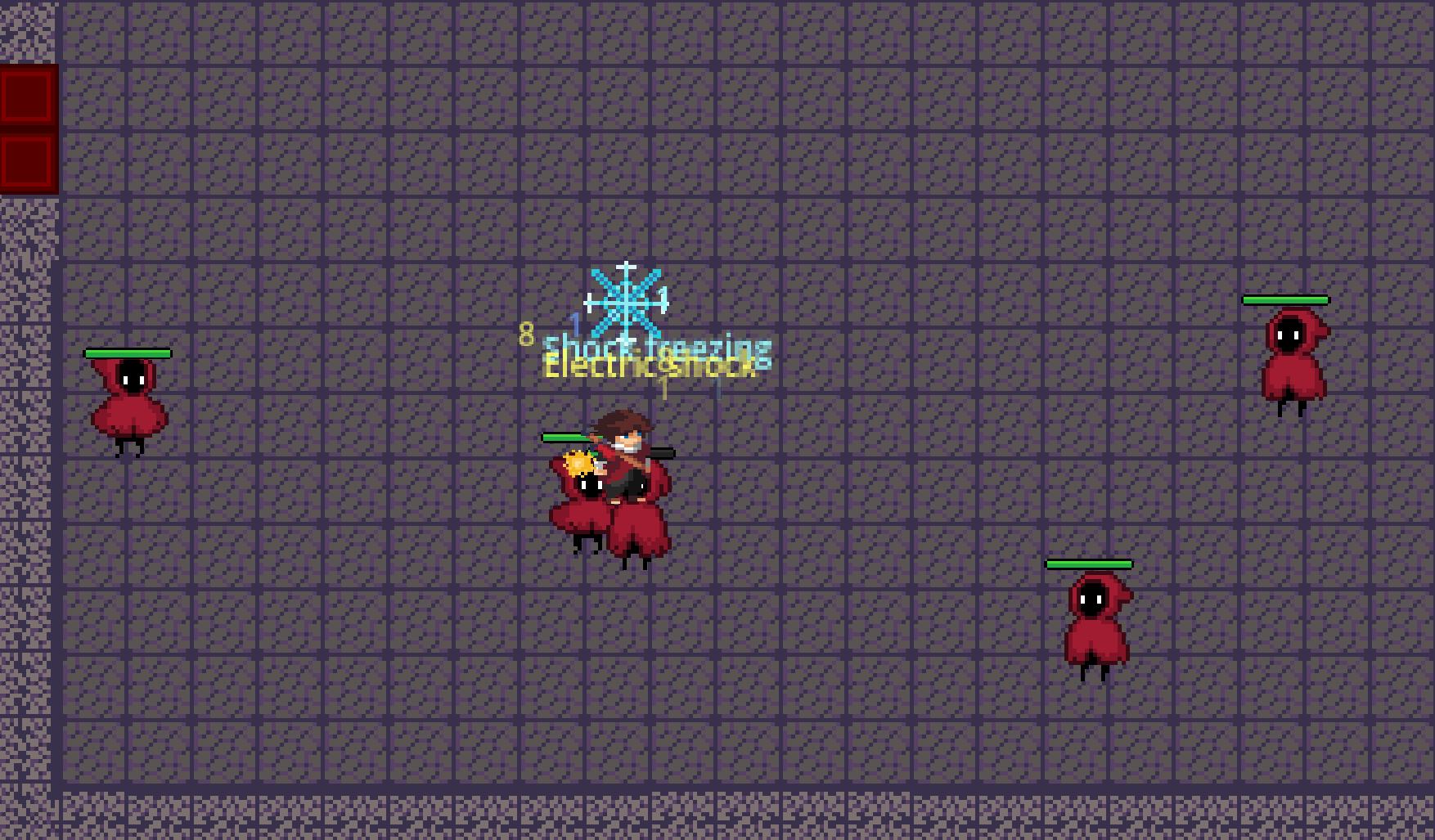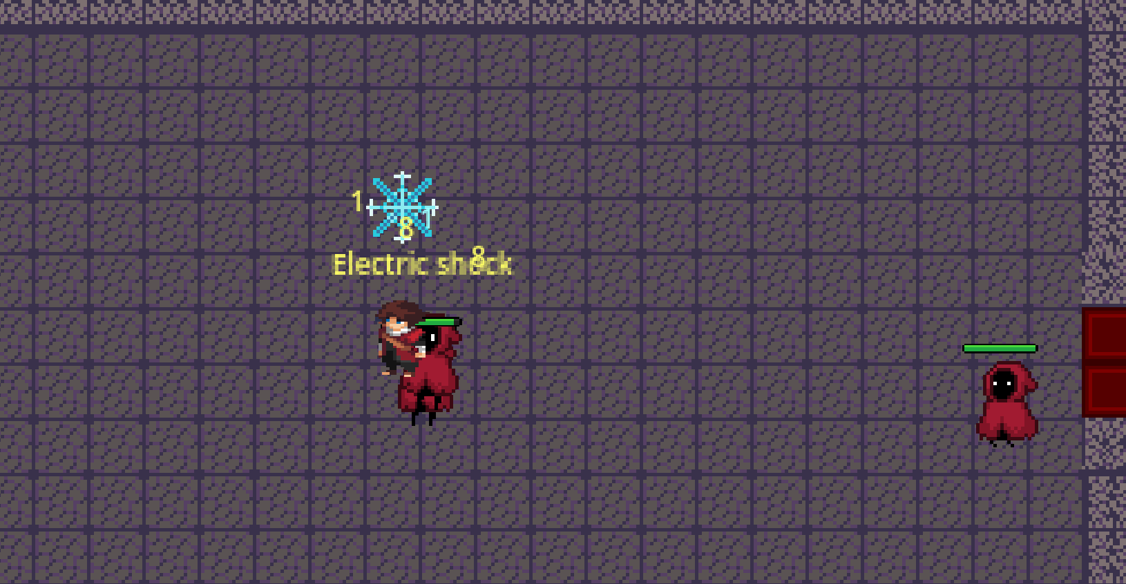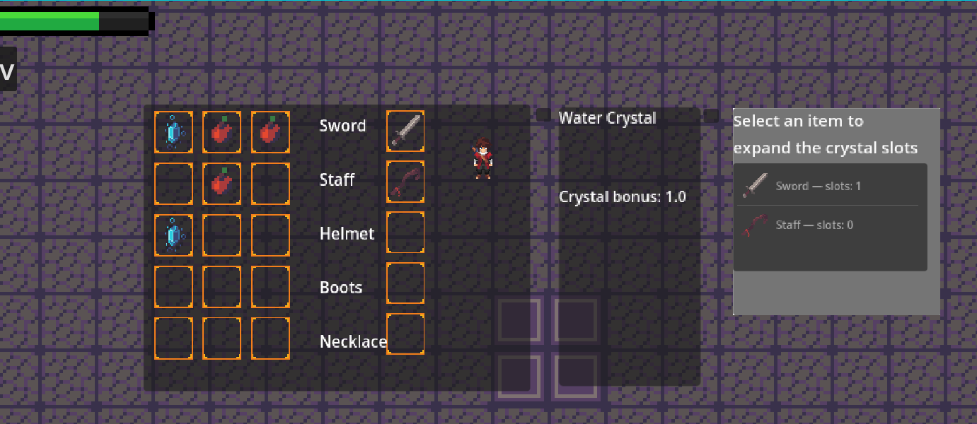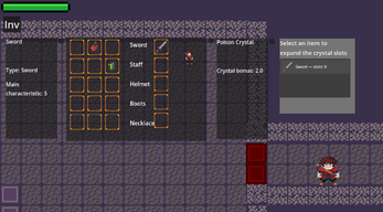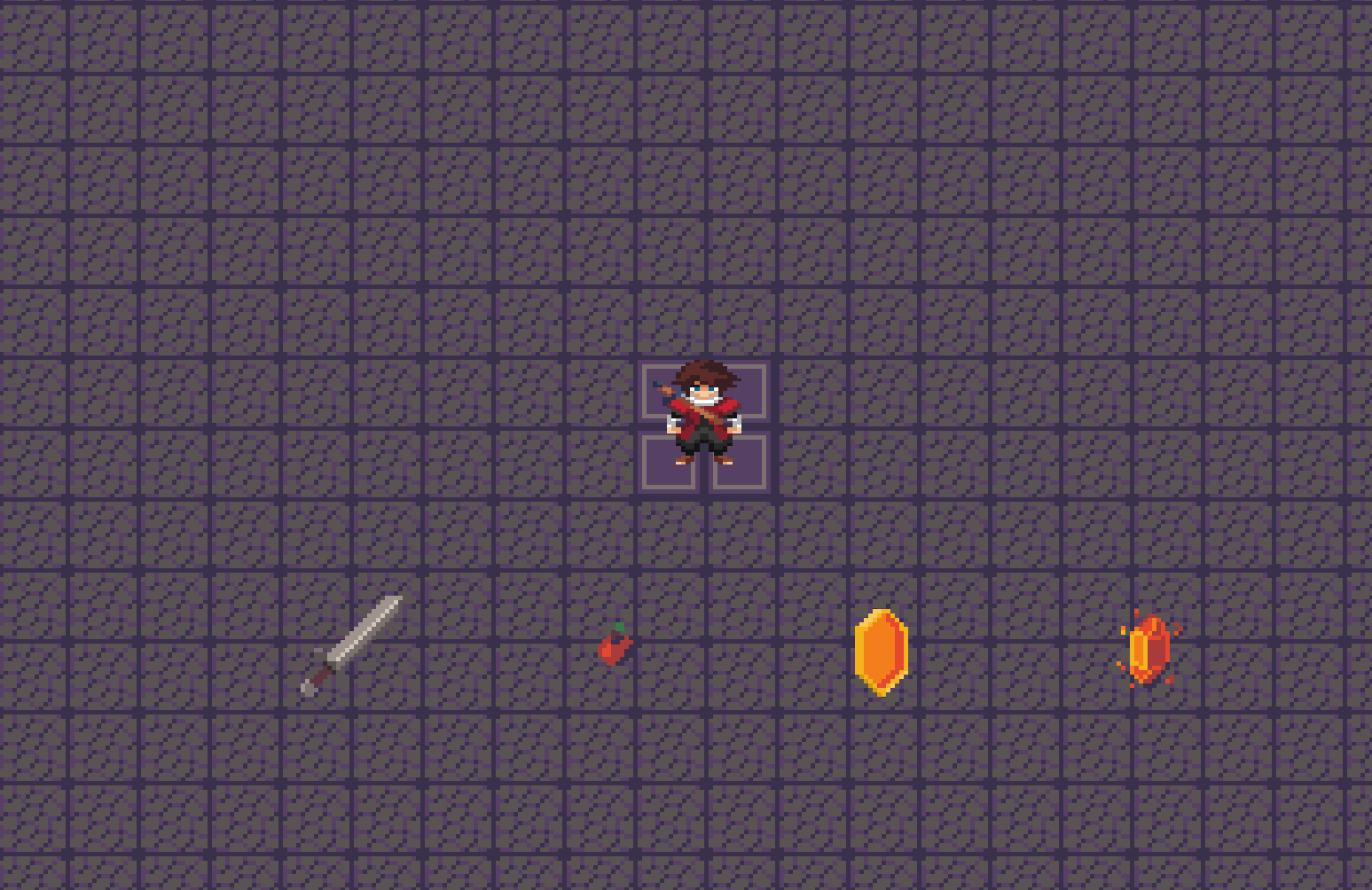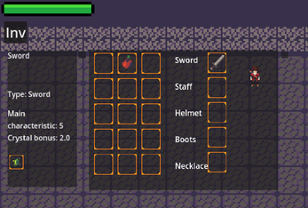 You enter a dungeon filled with the power of aspects. Every creature in this dungeon can use them. The main character can use aspects through special items and crystals that sometimes drop after killing monsters. In the starting room, the player will find a sword, an apple, a crystal slot expander and a random crystal. Go to the right room to continue the adventure, in each room you will find opponents using the power of aspects, aspects can interact with each other, causing special reactions (fire + water = steam), in the first cycle of the dungeon there are two rooms of enemies, after which there is a new starting room with new items. With each cycle, the number of rooms and enemies in the rooms themselves increases. At the moment, there are 5 aspects in the game: water, fire, ice, poison, lightning.